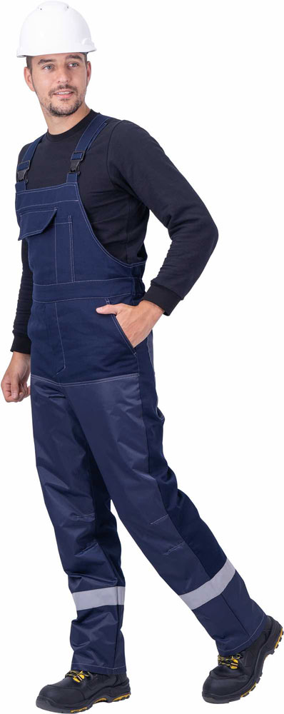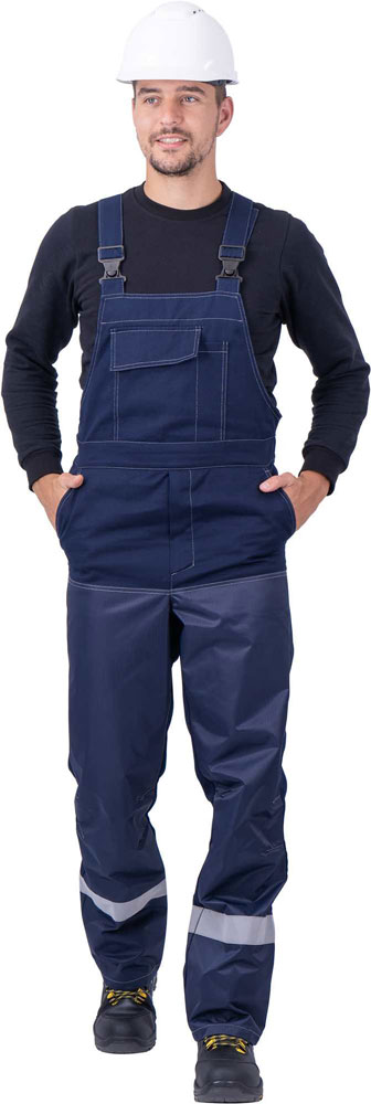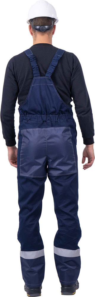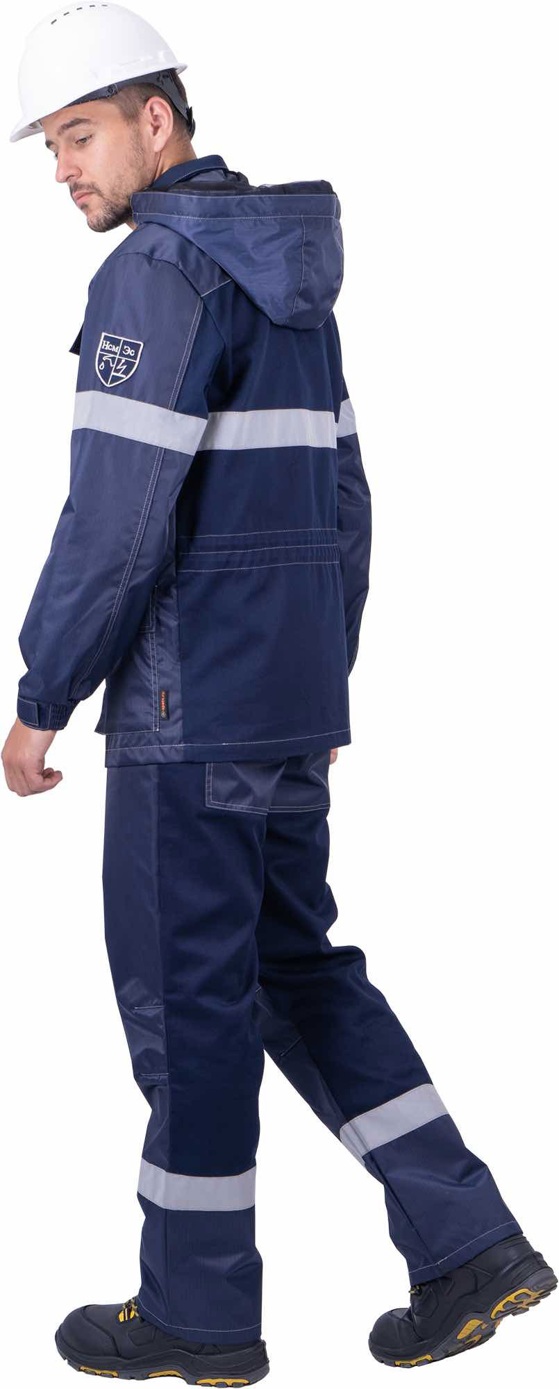 Комплект включает куртку и полукомбинезон, в конструкции предусмотрены световозвращающие полосы шириной 50 мм, улучшающие заметность работника при низкой видимости.