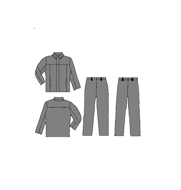 Костюм: куртка, брюки. Куртка с центральной потайной застёжкой на пуговицы, с отложным воротником, карманы в рельефных швах, внутренние манжеты в рукавах. Вентиляционные отверстия: под проймой, на спинке в шве притачивания кокетки. Брюки прямые, с застёжками в боковых швах, карманы в боковых прорезях.