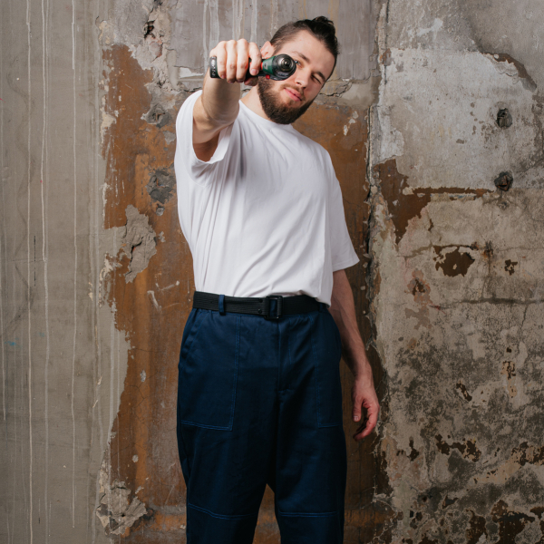 На передних половинках в верхней части брюк расположены боковые накладные карманы.
