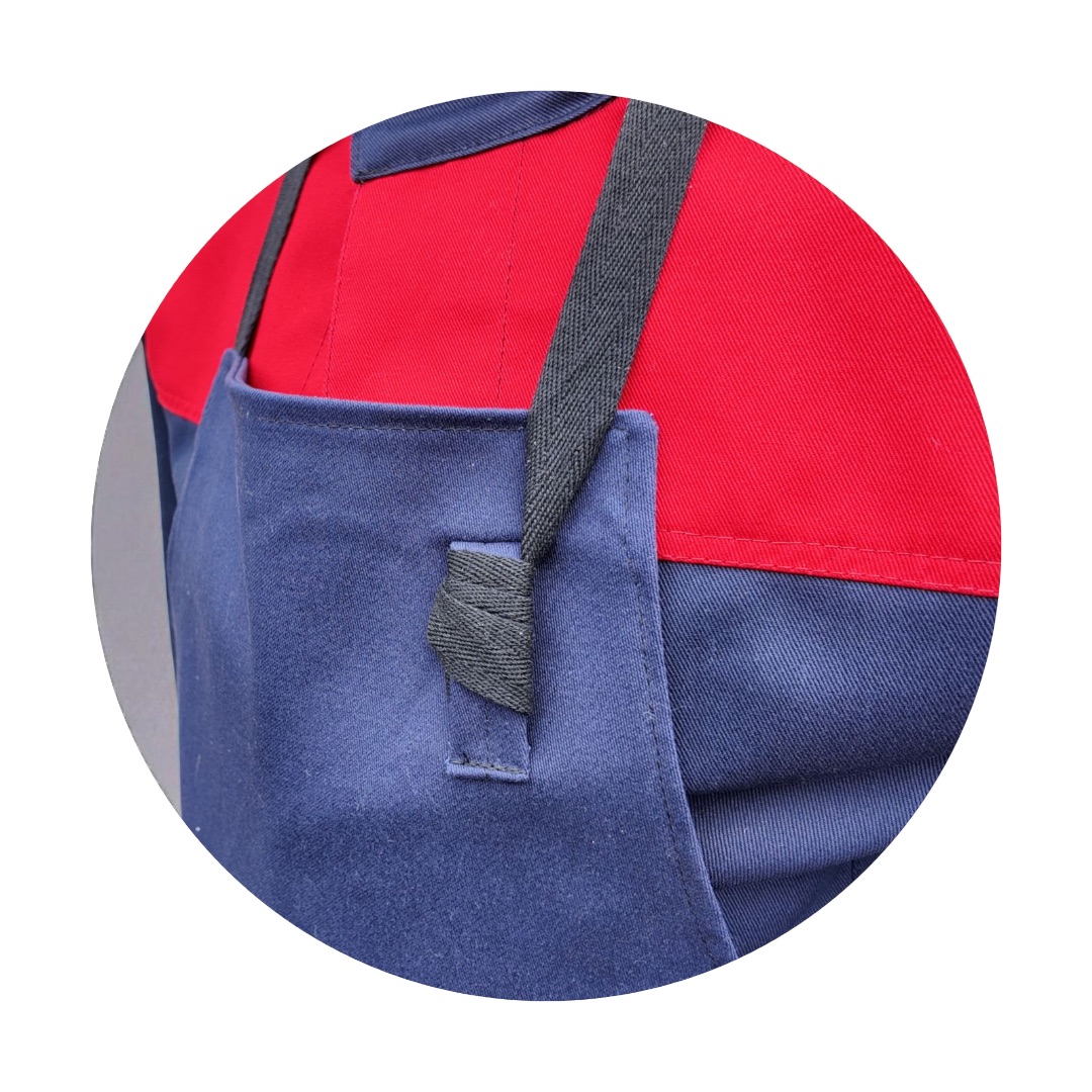 Фартук изготовлен из плотной хлопковой ткани с огнезащитной пропиткой, которая повышает устойчивость материала к воздействию высоких температур и искр. Конструкция предусматривает цельнокроеный нагрудник, обеспечивающий дополнительную защиту верхней части корпуса.