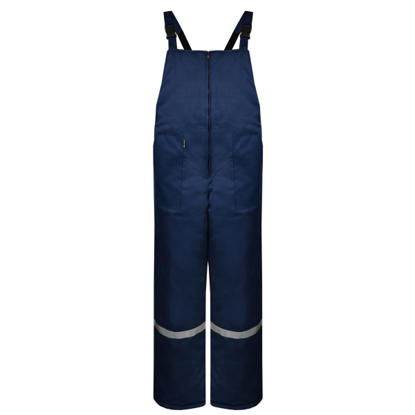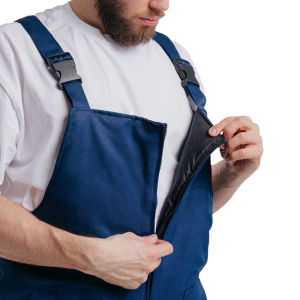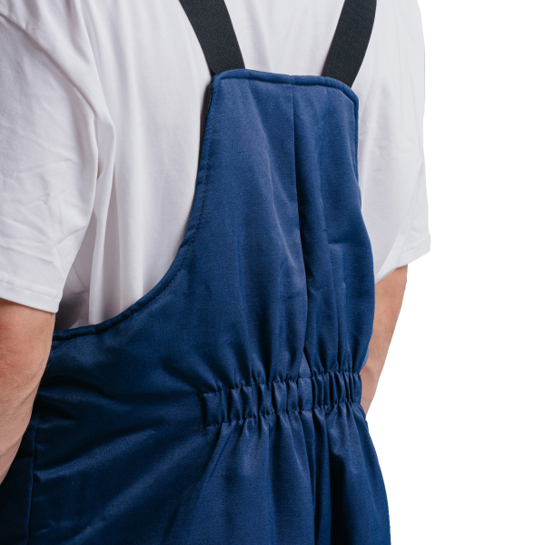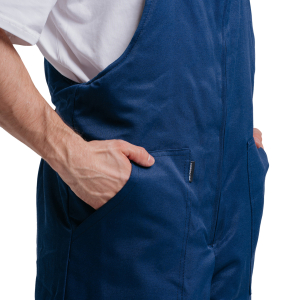 Полукомбинезон отличается продуманной эргономикой и практичностью. В верхней части передних половинок расположены накладные боковые карманы. Застёжка гульфика выполнена на молнии. По задней части полукомбинезона вшита резинка для регулировки объёма и удобной посадки.
