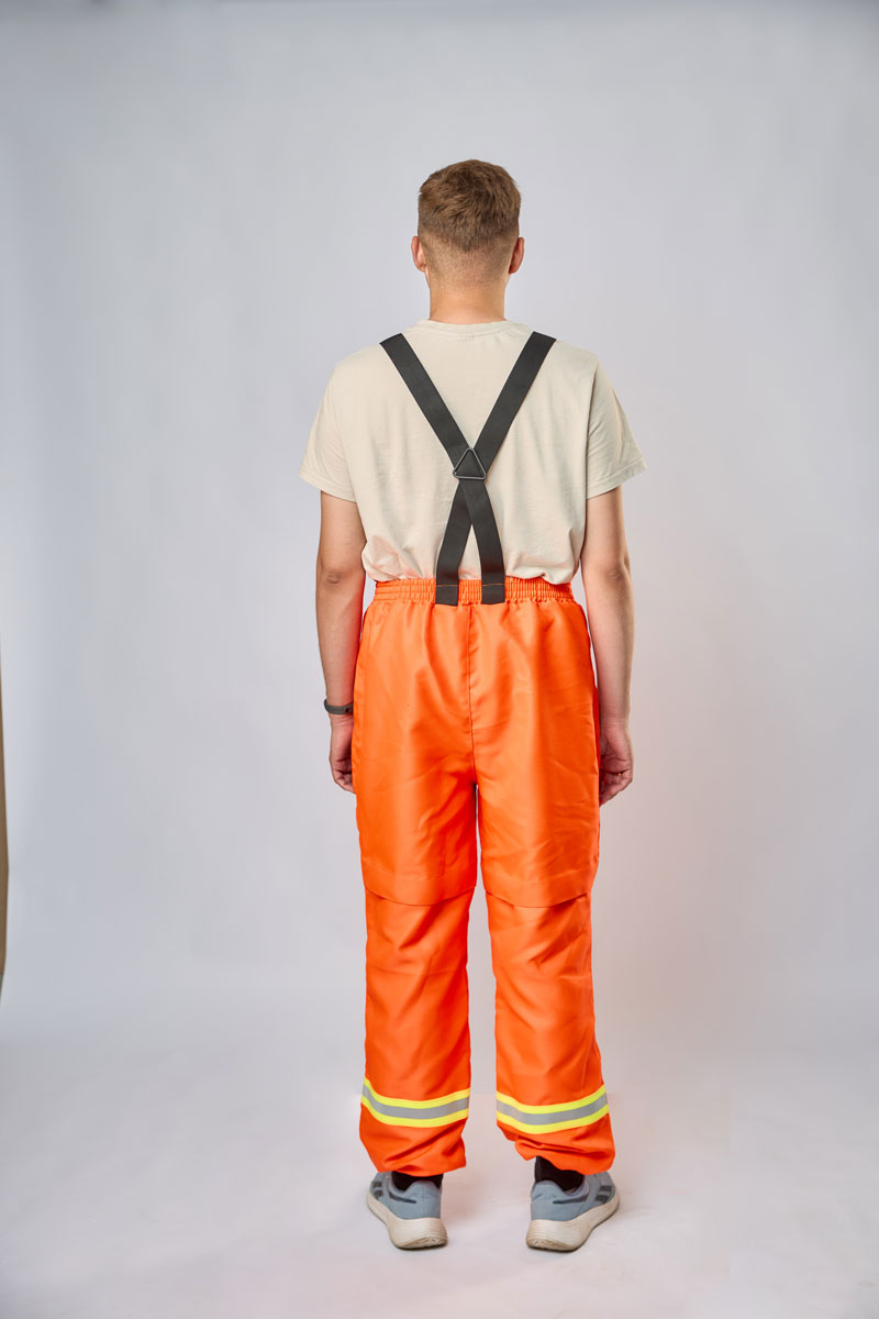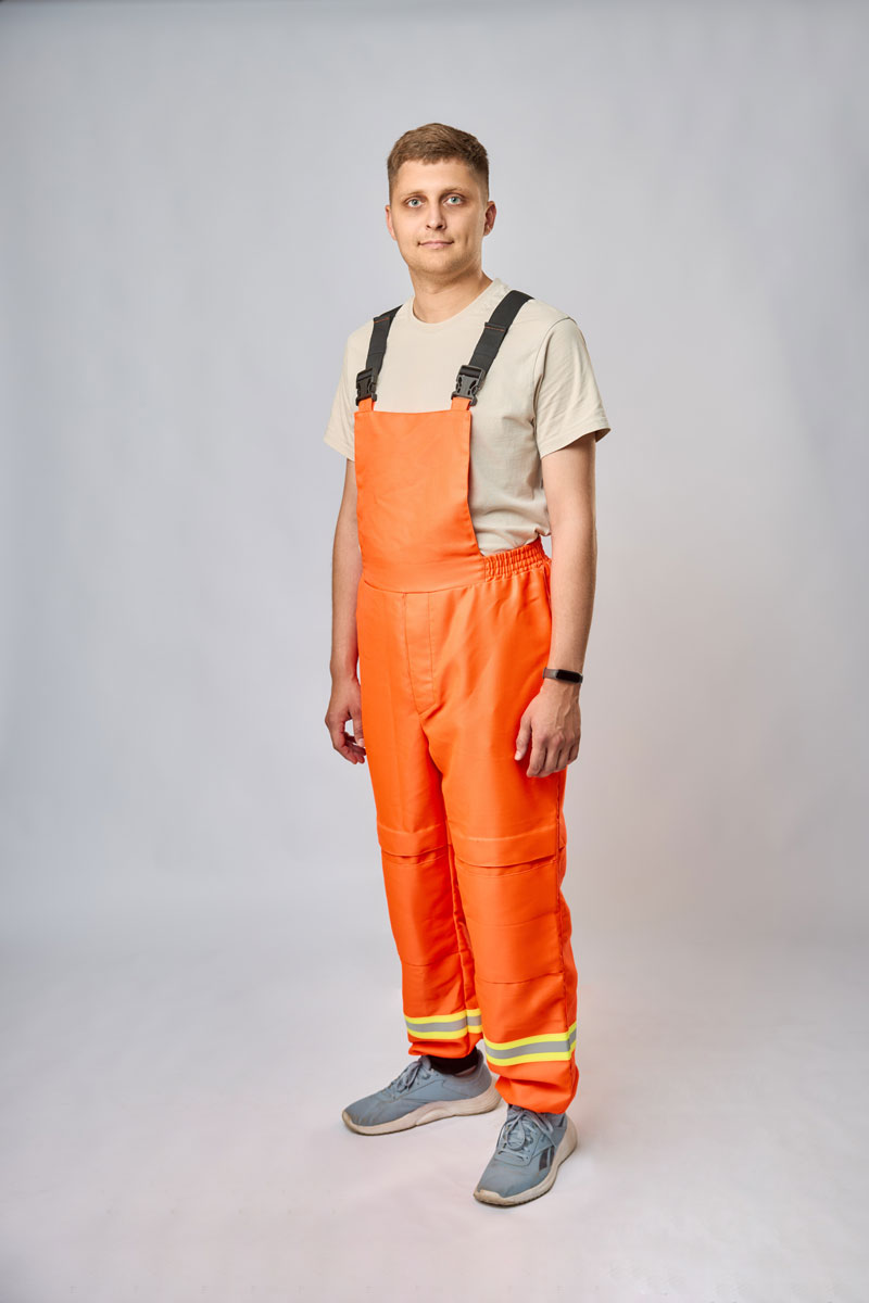 Комплект состоит из куртки с капюшоном и полукомбинезона, выполненных в ярком сигнальном оранжевом цвете, обеспечивающем хорошую заметность в задымлённой и лесной среде.